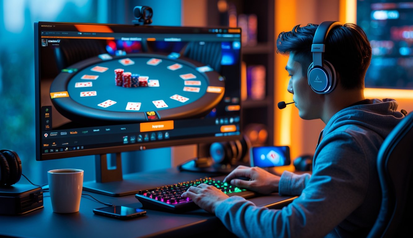 Seorang pemain sedang bermain poker online di depan komputer dengan kartu dan chip poker terlihat di layar.
